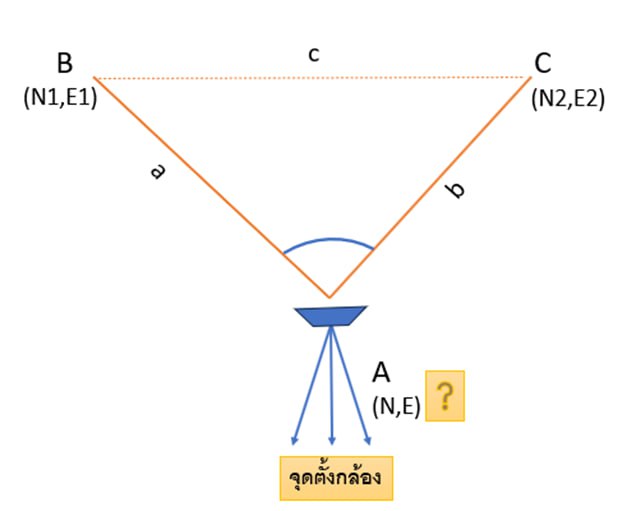 - A เป็นจุดตั้งกล้องที่ต้องคำนวนหาค่าพิกัด