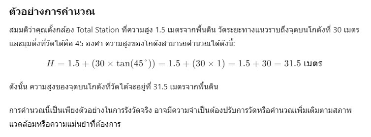 - ใช้สูตรในการคำนวณความสูงของจุดที่ต้องการวัด โดยคำนึงถึงค่ามุมดิ่งและระยะทางแนวราบที่ได้จากการวัด
