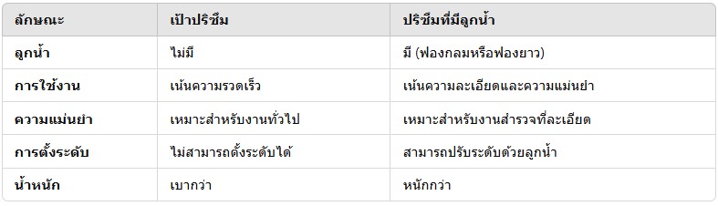 การเลือกใช้อุปกรณ์ขึ้นอยู่กับลักษณะงานที่ต้องการ หากต้องการความรวดเร็วในงานทั่วไป เป้าปริซึมก็ตอบโจทย์ แต่ถ้าต้องการความแม่นยำในงานสำรวจเฉพาะทาง ปริซึมที่มีลูกน้ำจะให้ผลลัพธ์ที่ดีกว่า