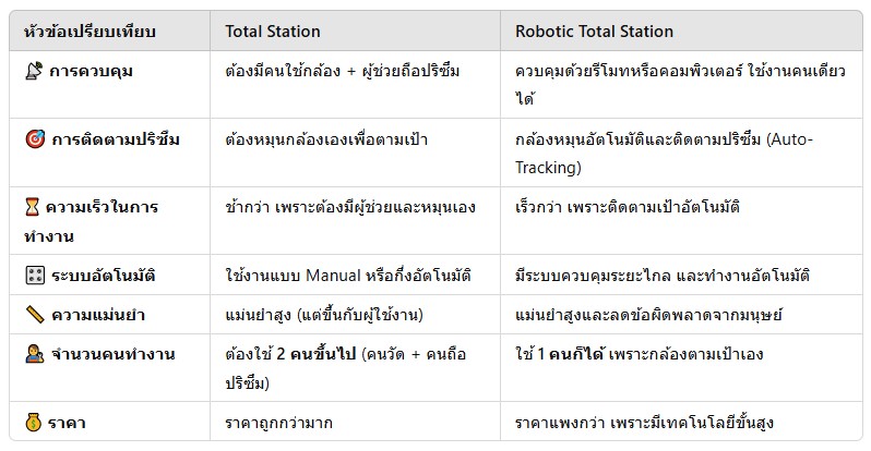 Total Station และ Robotic Total Station เป็นเครื่องมือสำรวจที่ใช้หลักการเดียวกัน แต่มีความแตกต่างกันในแง่ของ การควบคุม, ประสิทธิภาพ และการใช้งาน
