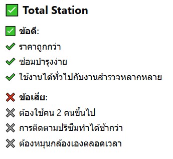 Total Station เหมาะกับ งานก่อสร้างทั่วไป งานสำรวจภูมิประเทศ งานที่มีทีมสำรวจ 2 คนขึ้นไป งานที่ต้องการลดค่าใช้จ่าย